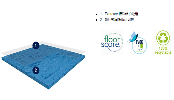经过Evercare技术处理的地板,即使遇到油性笔的污染,也能一擦而净;遇到渗透力极强的碘酊,表面结珠不渗透;遇到强酸强碱,表面不变色;即使有重物、推车在上面拖拉,也难有划痕出现;能抵御84消毒液和75%以上酒精消毒。