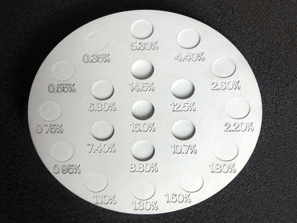 测试卡由 20 mm 厚的铝板制成。在该铝板上均布 1 cm 孔径圆孔,孔的深度(mm)及对比度(括号内数值%)从 0.07 mm(0.35%)到 3.2 mm(16%)变化,共计 19 个圆孔。它们分别是:0.07(0.35%)、0.11(0.55%)、0.15(0.75%)、0.19(0.95)、0.22(1.1%)、0.26(1.3%)、0.32(1.6%)、0.36(1.8%)、0.44(2.2%)、0.52(2.6%)、0.88(4.4%)、1.06(5.3%)、1.36(6.8%)、1.48(7.4%)、1.76(8.8%)、2.14(10.7%)、2.5(12.5%)、2.9(14.5%)、3.2(16%)。
