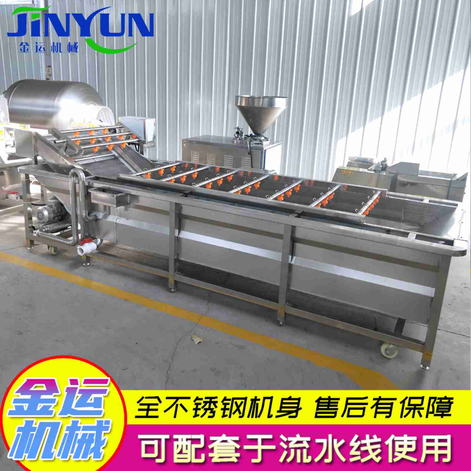 流水线中各单机可根据用户各自不同的加工特点量身定制,可加装滚筒和毛刷、过滤泡沫和漂浮物,最大程度满足工艺要求;清洗运行速度变频可调,用户可根据不同的清洗内容任意设定;该机结构紧凑,自动化程度高,适用于各种加工规模企业使用。