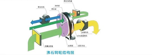 转轮内沸石VOCs浓缩饱和后,再利用热交换器提供的高温空气(约180-200℃)来进行脱附。脱附完成后旋转至冷却区降温,再旋转至吸附浓缩区。