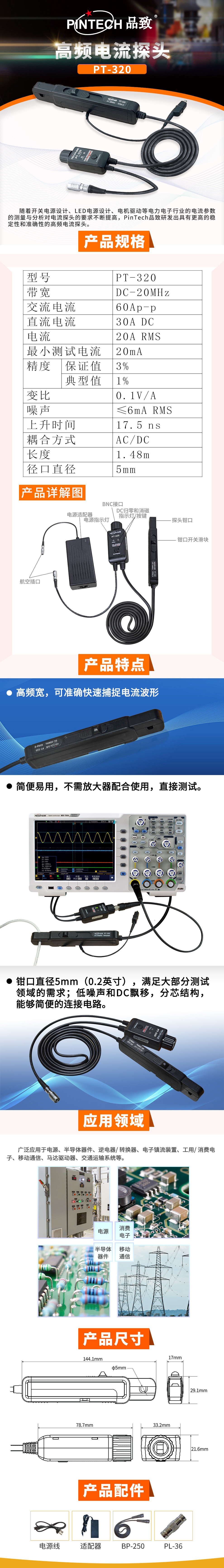 简便易用,准确进行AC/DC 电流测量;DC-20MHz 高带宽;钳口直径5mm(0.2 英寸);精度高,DC 增益误差一般小于1%;分芯结构,简便地连接电路;低噪声和DC 飘移。 应用:电源、半导体器件;逆电器/转换器、电子镇流装置;工用/消费电子、移动通信;马达驱动器、交通运输系统、传播延迟测量等。