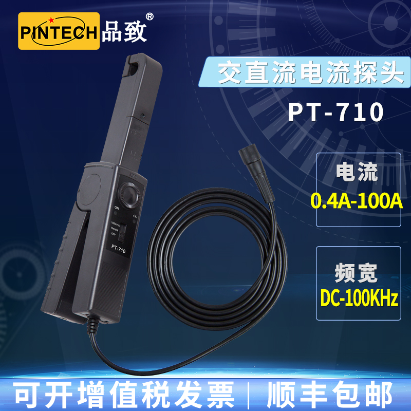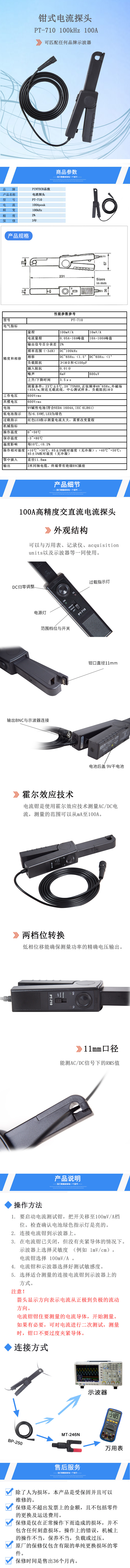 PT-710(100kHz,0.05-100A)交直流电流探头 简略说明: 100kHZ ,0.05A-10A, 10A-100A 兼容匹配任何品牌示波器。