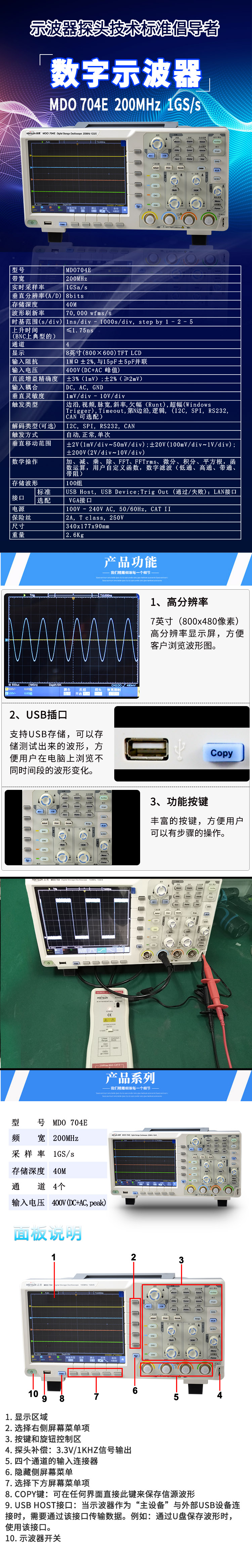 极限与模板测试、功率测量与分析、波形录制与回放、模数混合信号分析、任意函数发生等功能,支持以太网程控,
