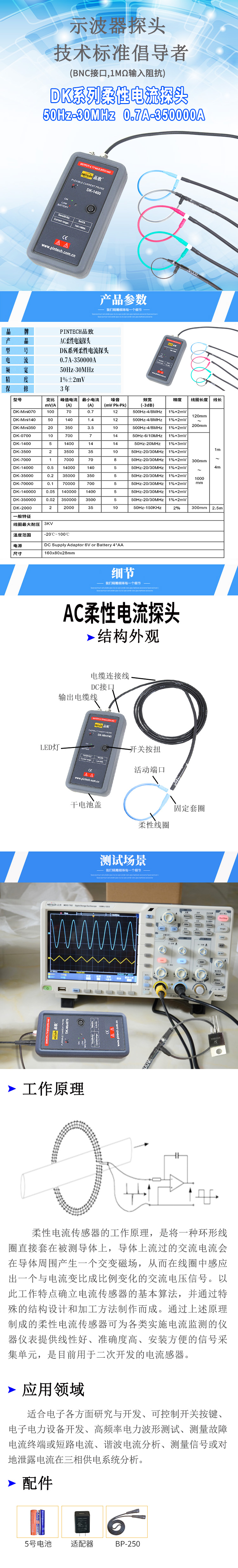 应用:可控制开关按键,电子电力设备开发、高频率电流波形图测试、测量故障电流中断或断路电流、测量脉冲电流,谐波电流分析。测量信号或对地泄漏电流在三相供电系统分析。 瞬时±7V输出直接插入范围,数据采集设备,数字万用表或功率记录器,灵活,clip-around线圈长度从120毫米至1000毫米——其他长度可定制设计 容易钳入狭小封闭的空间,线圈可以锁定、非接触性——不影响测试进行中